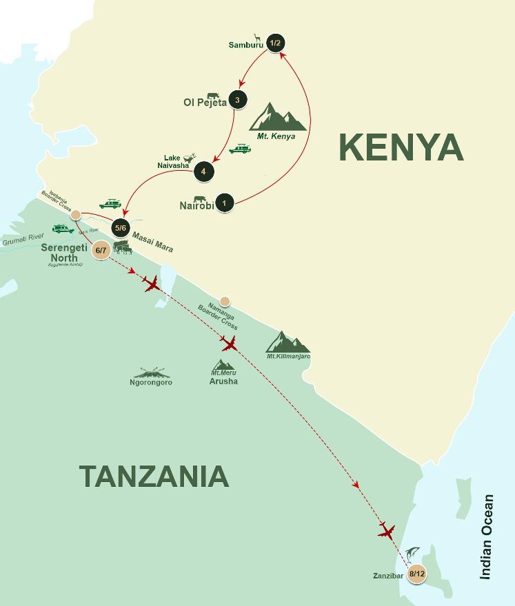 Embark on an extraordinary 12-day luxury safari through Kenya and Tanzania, seamlessly blending adventure, culture, and coastal indulgence. Begin in Samburu, home to rare northern species and rich cultural encounters, before heading to Ol Pejeta Conservancy for up-close rhino experiences and Big Five game drives. Continue to the iconic Maasai Mara, where golden plains teem with wildlife and predator drama unfolds daily. Cross into Tanzania’s Northern Serengeti to follow the Great Migration along the Mara River, witnessing nature’s most spectacular theatre. Conclude your journey in Zanzibar’s tropical paradise, with guided spice tours, a sunset dhow cruise, and the chance to swim with dolphins along Nungwi’s turquoise shores. Featuring handpicked luxury camps, private transfers, and expert guides, this itinerary is tailored for discerning travelers seeking the ultimate East African safari and beach escape.