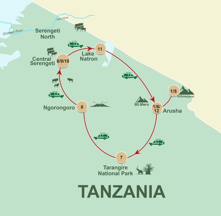 This 12-night Tanzania itinerary combines adventure, scenery, and wildlife for an extraordinary experience. Begin your ascent of Mount Kilimanjaro via the Marangu Route, trekking through lush rainforest, alpine meadows, and glacial landscapes before reaching the summit of Uhuru Peak—the highest point in Africa. After your descent, transition into a luxury safari across Tarangire’s elephant-filled plains, the breathtaking Ngorongoro Crater, and the predator-rich Central Serengeti, known for its lions, cheetahs, and vast herds. Continue to the striking landscapes of Lake Natron, where flamingos gather along mineral-rich shores beneath volcanic peaks. With each leg offering a new perspective, this itinerary blends physical achievement with authentic wilderness exploration and cultural depth. Ideal for active travellers seeking a seamless balance of adventure, comfort, and the unforgettable natural beauty that defines Tanzania’s most iconic destinations.