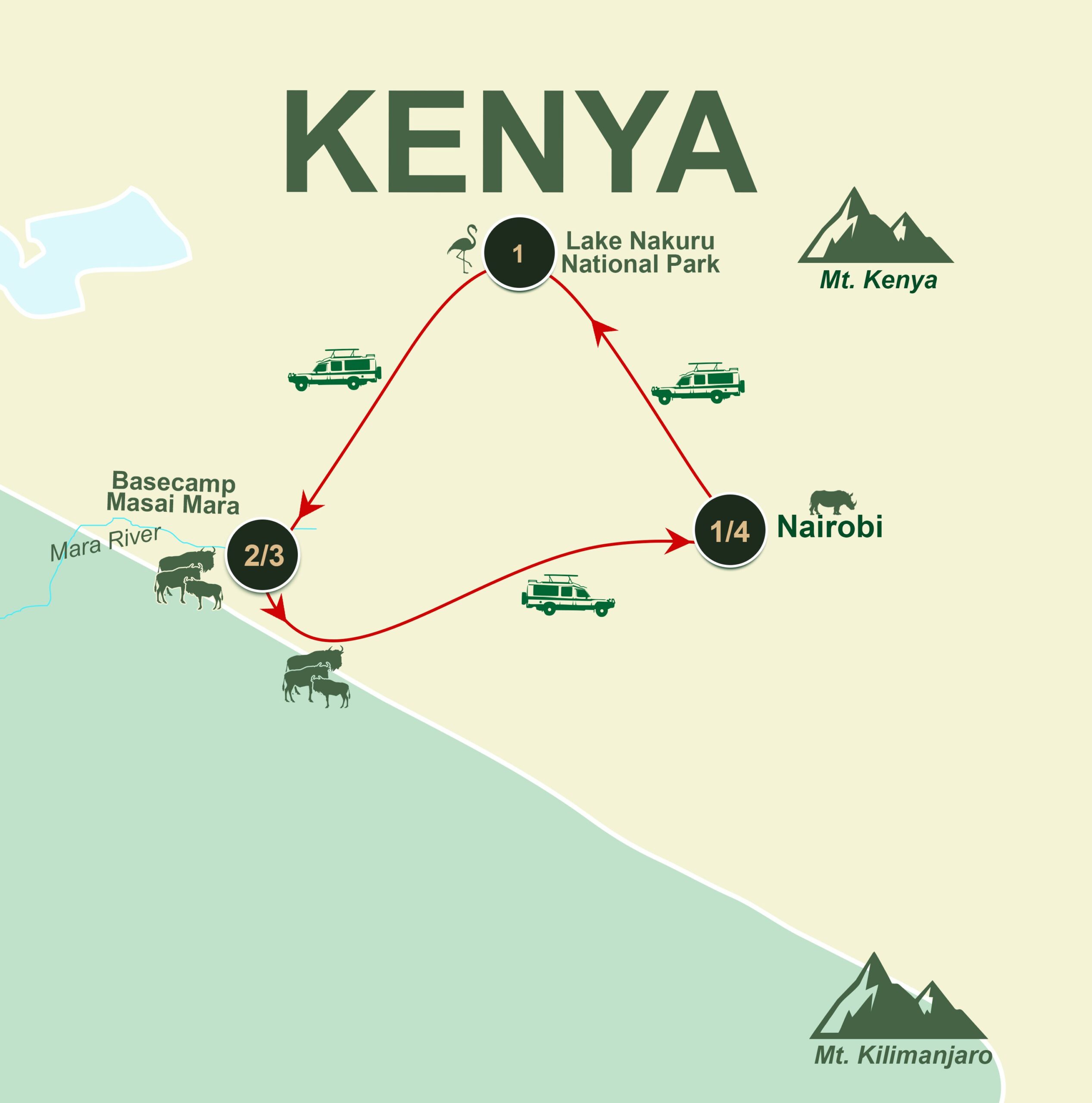 This well-balanced 4-day itinerary combines the scenic beauty of the Great Rift Valley with the legendary wildlife of the Masai Mara. Ideal for travelers with limited time yet high expectations, it offers premium lodge stays, immersive game viewing, and exclusive activities such as a boat safari on Lake Naivasha.