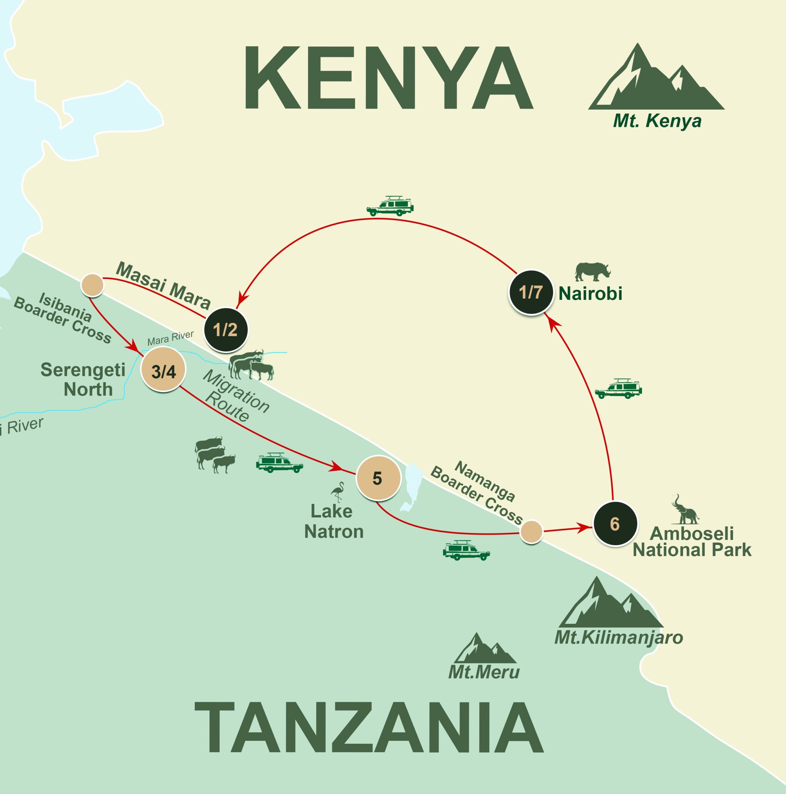 This immersive 7-day cross-border safari takes you deep into East Africa’s most iconic landscapes, from the predator-rich plains of Masai Mara to the remote wilderness of Lake Natron and the elephant-studded Amboseli. It’s a seamless blend of big game encounters, dramatic migration scenes, and scenic diversity.