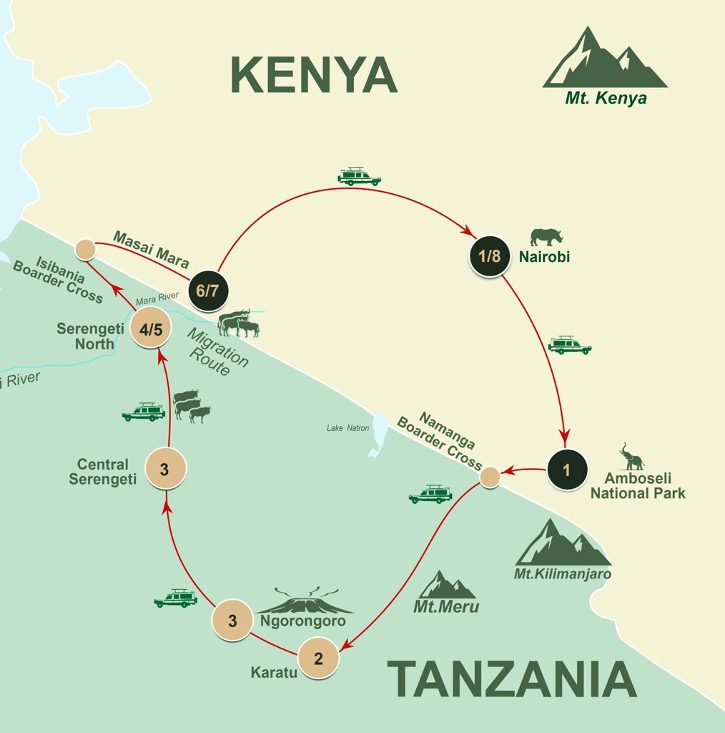 Explore the best of Kenya and Tanzania on this exclusive 8-day cross-border luxury safari designed for discerning travelers. Begin in Amboseli National Park, where majestic elephants roam beneath the snow-capped peak of Mount Kilimanjaro. Cross the Namanga border into Tanzania to experience the Ngorongoro Crater and Serengeti—two UNESCO World Heritage Sites renowned for Big Five sightings and the awe-inspiring Great Migration. Continue north through the Serengeti’s vast plains before re-entering Kenya via the Isebania border for unforgettable game drives in the world-famous Masai Mara. With luxury camps, seamless transfers, and expert-guided safaris in custom 4×4 vehicles, every moment is crafted for comfort and discovery. This journey offers unmatched access to Africa’s dramatic landscapes, vibrant wildlife, and the timeless rhythm of the savannah.