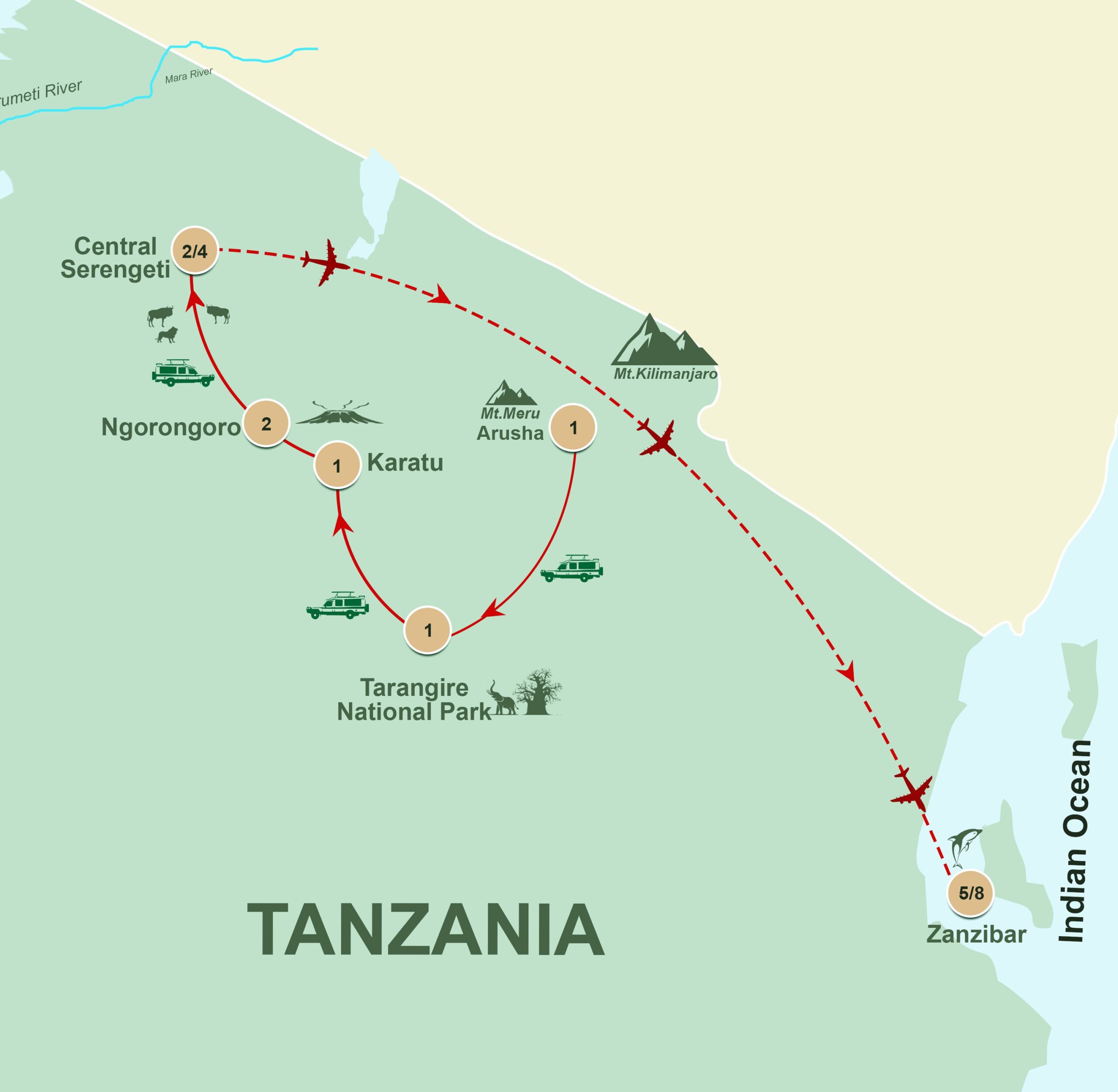 This immersive 8-day journey combines the raw beauty of Tanzania’s iconic northern safari circuit with the exotic charm of Zanzibar’s coastal paradise. From Big Five game drives in Tarangire and the Serengeti to tranquil beach moments in Nungwi, it’s the perfect fusion of wilderness and barefoot luxury.