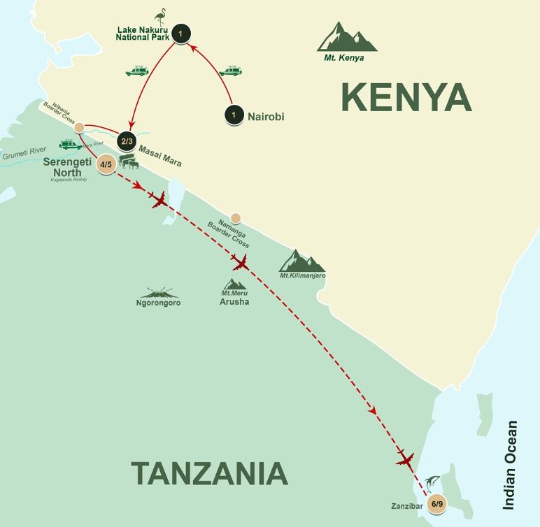 This nine-day luxury safari showcases the finest of East Africa, combining Kenya’s Lake Nakuru and Masai Mara with Tanzania’s Serengeti, before concluding on Zanzibar’s pristine beaches. Witness flamingo-filled lakes, predator-packed savannahs, and the dramatic Great Migration, all while enjoying refined accommodations and expert-guided game drives. Transition seamlessly to Zanzibar, where turquoise waters, soft sands, and barefoot luxury provide the perfect contrast to inland adventures. Designed for travelers who value both excitement and indulgence, this itinerary balances wildlife, culture, and coastal relaxation, offering an unforgettable East African experience that unites adventure, elegance, and the region’s most iconic landscapes.