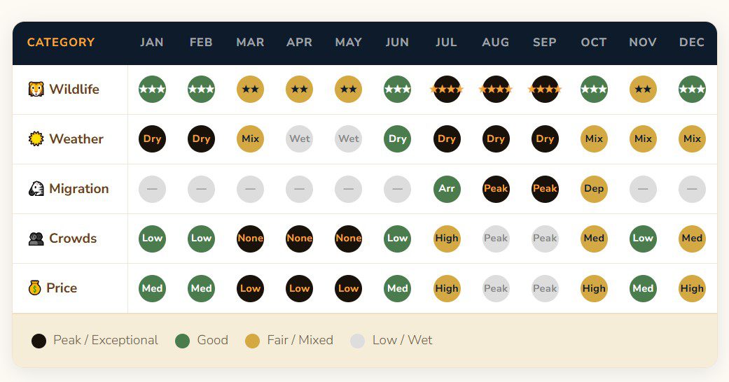 Best for: Budget travelers, photography enthusiasts, birdwatchers, and those seeking total wilderness solitude. March and June are lighter on rain and represent the best value-to-experience ratio in the entire year. Book: 4–8 weeks ahead. Some luxury camps offer 30–50% off.